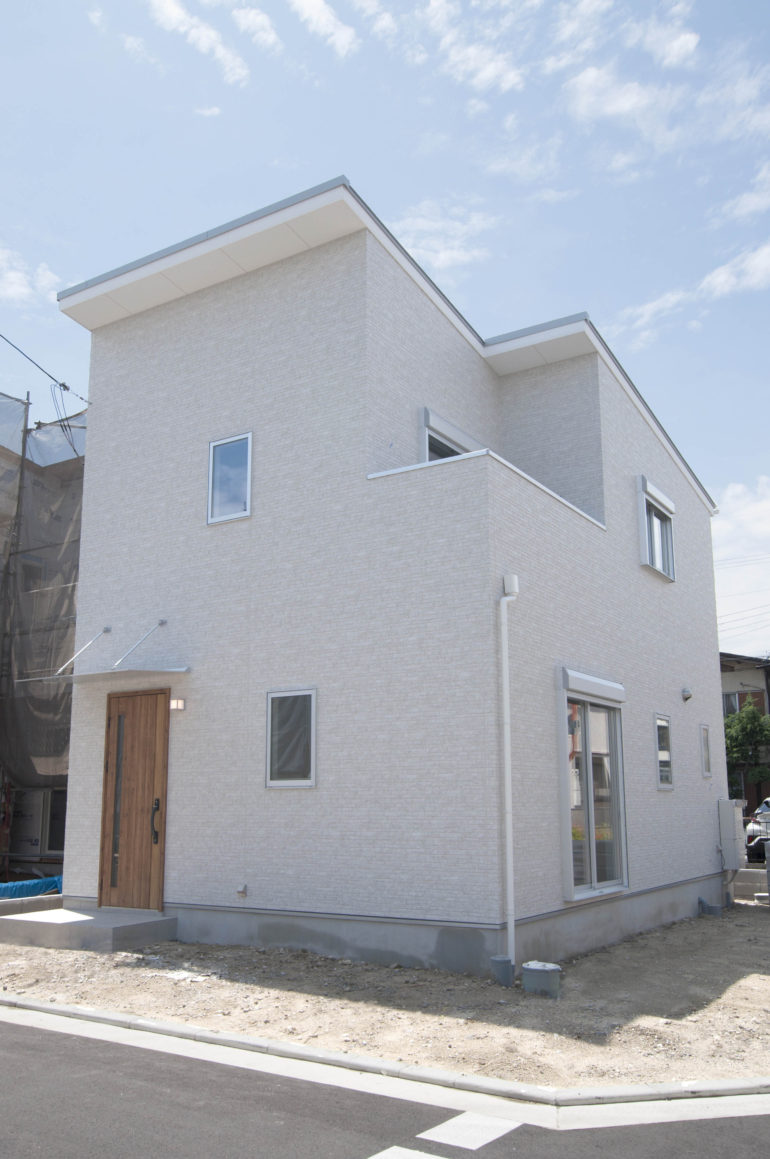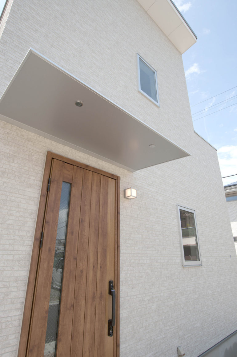 ホワイトの外壁にウッド調の玄関ドアが映えるナチュラルテイストのお家