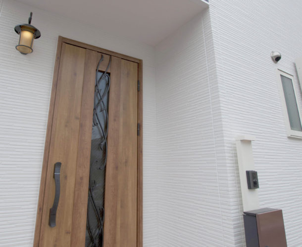 白×黒ツートンカラーのモダンな外壁に、ナチュラルテイストの玄関ドアやポストユニット・アンティーク調のポーチライトが映える外観デザイン