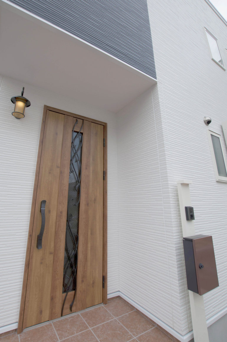 白×黒ツートンカラーのモダンな外壁に、ナチュラルテイストの玄関ドアやポストユニット・アンティーク調のポーチライトが映える外観デザイン