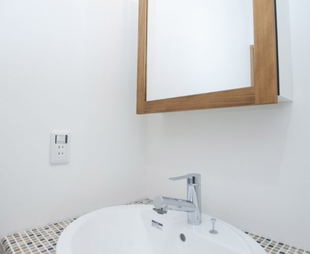 他にも、モザイクタイルをあしらった洗面台や無垢材のテレビボード、リビング階段の黒アイアン手摺りなどテイストにマッチしたアイテムを随所に採用