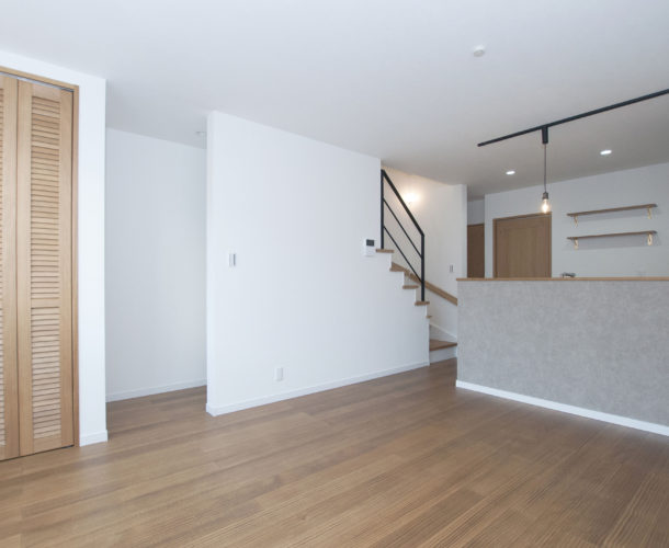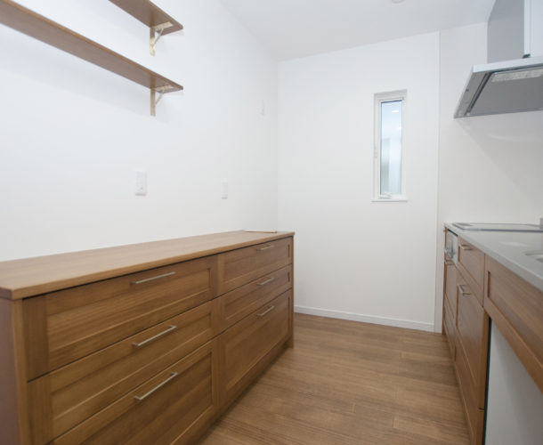 室内空間はフローリングをはじめ、クローゼットドアやキッチン家具・飾り棚など、ヴィンテージ風の木の質感を多分に用いたカフェテイストで統一されています。