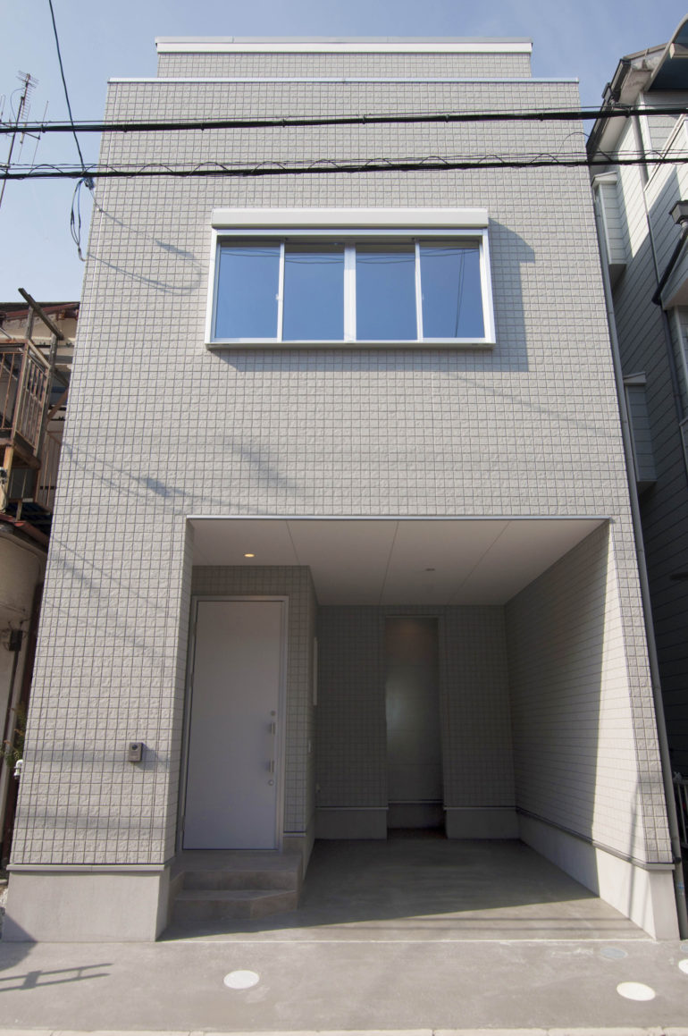 ベーシックなブロック調の外壁をベースに、コンクリート打ちっぱなし風のアクセントを合わせたモダンな外観デザイン
