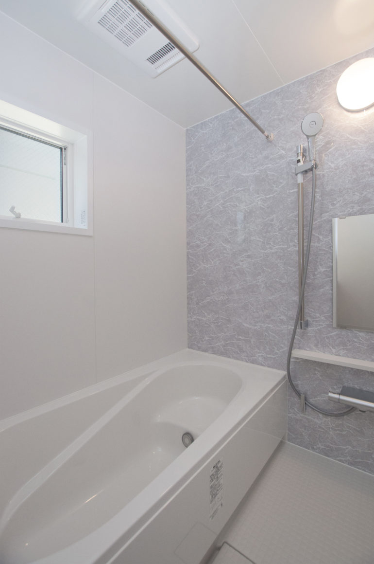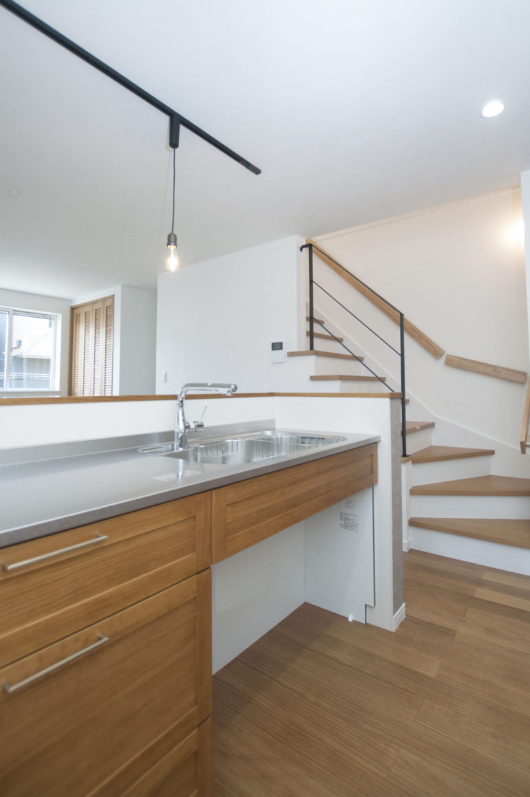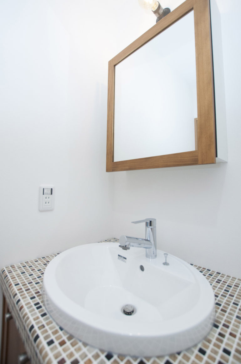 他にも、モザイクタイルをあしらった洗面台や無垢材のテレビボード、リビング階段の黒アイアン手摺りなどテイストにマッチしたアイテムを随所に採用