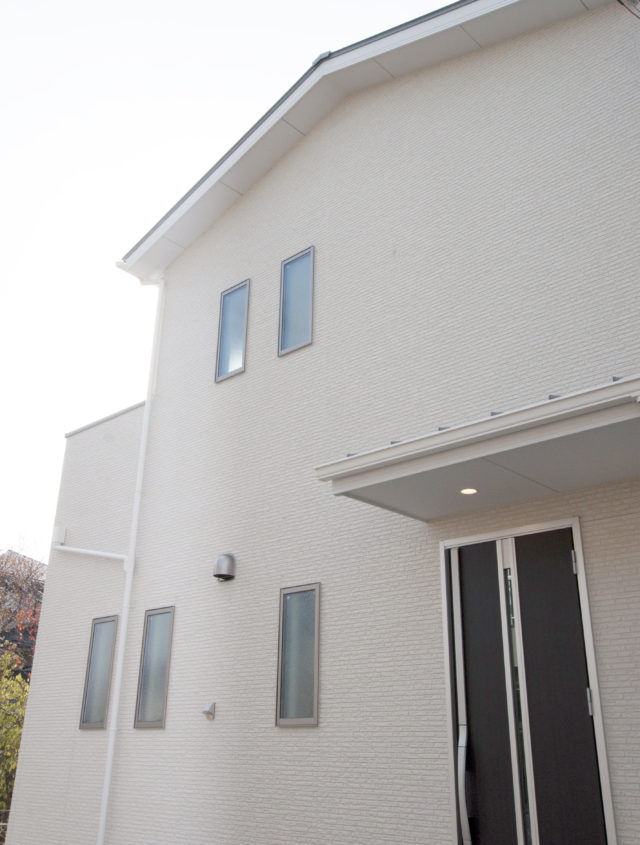 モノトーンのモダンな外観は、角地と相まって迫力満点明るい光が差し込む立地を活かした間取りと、室内の建具や設備の色合いをナチュラル色で統一