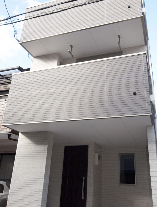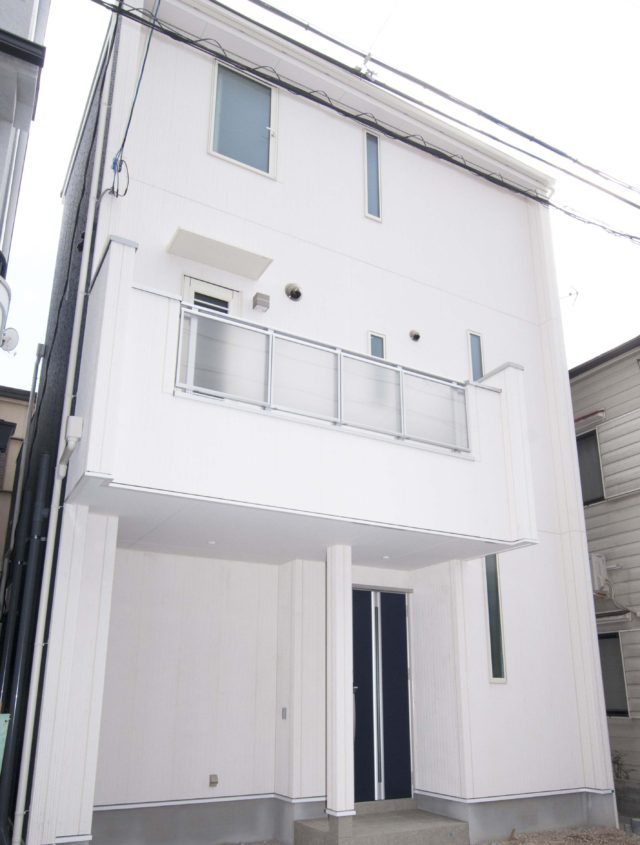 鮮やかなブルーの玄関ドアと2階バルコニーのクリアパネルが印象的なモダンスタイルの外観デザイン室内も清潔感のある白を貴重にしたモダンスタイ