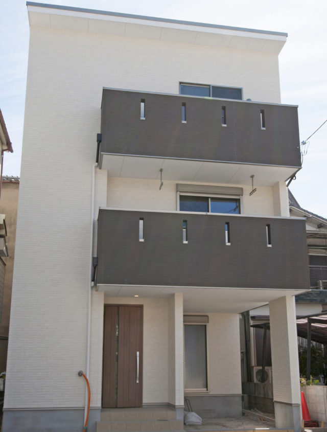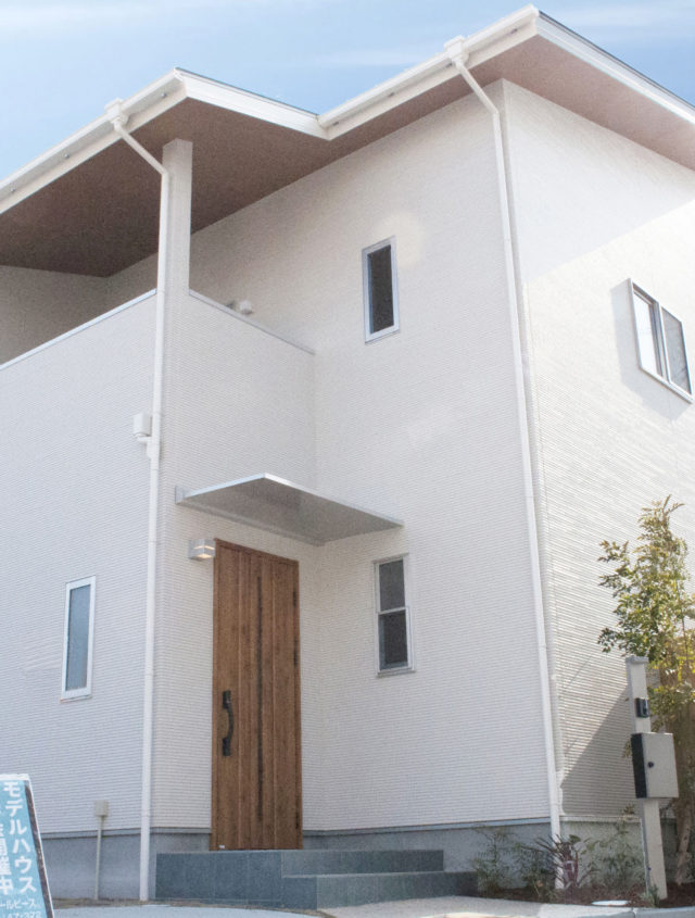 広々LDK・全居室6帖以上を確保したゆとりの4LDK住宅清潔感ある白い外壁をベースにバルコニー部分のツートンカラーで、モダンな外観イメー